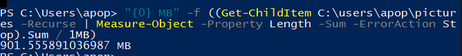 Also shown, is how easy and enjoyable it is to find a folder size with the mighty Microsoft PowerShell: