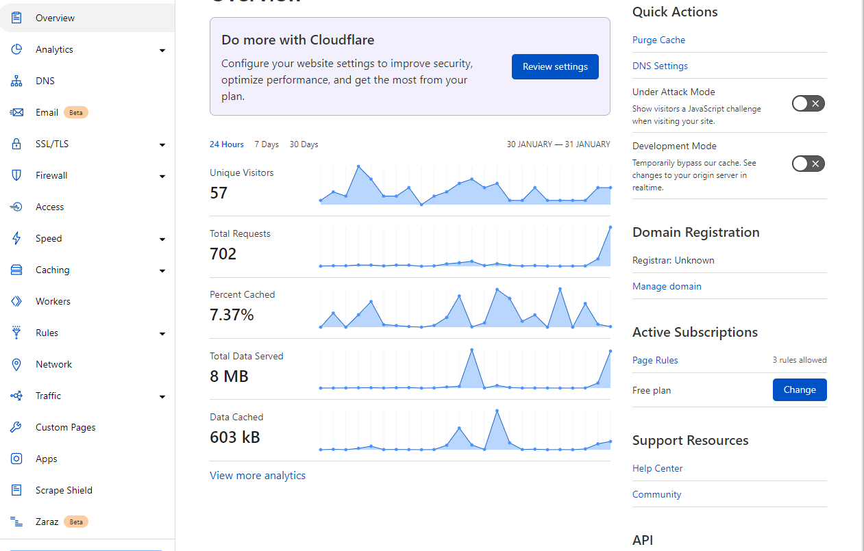 - A free tier that includes all the above, as well as free DNS (the phonebook of the Internet), firewall services (I don't need visitors from Russia), the incredible cloudflared client that helps run webservices without NAT/port forwarding (this last bit is amazing, trust me), and a bevy of other niche features.