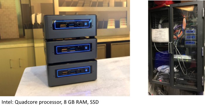 The three guys on the left (some Intel NUCs, probably $500 CAD) go into the guy on the right. At the initial setup of the store, a networking team puts in a relatively simple network switch setup, like any other fast food place's IT protocol, except this "server" is hosted on-site. And it's running on Kubernetes. On these three little NUCs. And you can throw one in the ocean, and put a new one in.