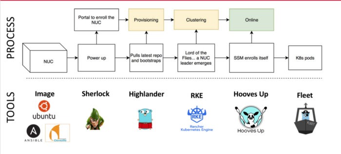 - When a new NUC joins the cluster, it'll be configured over the network automagically and ask the others if one of them is the leader.