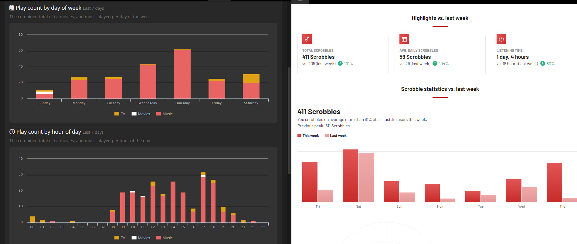 I listen to a lot of music and, since I'm a big fat nerd, I love running analytics on my own habits/behaviour. I run a Tautulli server (Python-based monitoring app for my Plex media server) and have my streaming sources forward traffic to Last.fm, which gives me a weekly listening report.